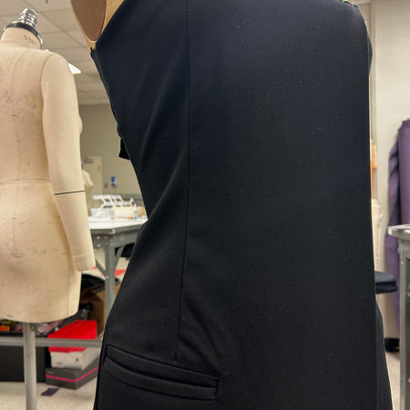 The construction of this garment is laid out in a series of steps: first the conceptual sketch was created, followed by draping techniques on a mannequin. First prototype was created and fit sessions where held to examine fit accuracy and comfort, followed by two more fit sessions. Then, patterns pieces where adjusted to meet fit standards. Lastly, the construction of final garment was created.