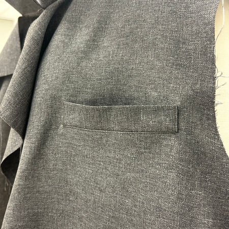 The journey of crafting this piece unfolded through a series of steps. It all started with the inception of creative ideas translated into inspirational sketches. Subsequently, extensive research on construction of blazer and tailored trouser techniques were required. The development stage of creating pattern pieces for both the blazer and pants were put into place. The first prototype took shape, serving as a canvas for adjustments made on a fit model. Detailed modifications were applied to the sleeves, length of pant, size of blazer, and pleats on the pants. Finally, the construction of the final garment was made.