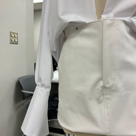 The creation process unfolded through a series of steps: from initial inspiration sketch to development of pattern pieces on Gerber Accumark followed by the creation of the first prototype which was examined during fit sessions to meet fit and comfort. After modifications were made, the final garment pieces were created.