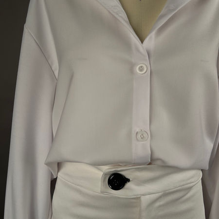 'Madison Avenue' embodies simplicity and sleek elegance, designed for a minimalistic yet sophisticated look suitable for both office wear and casual errands. This look features an oversized button down top which was graded two sizes larger to achieve the desired oversized silhouette. The shirt has six buttons in the front, complemented with a wide vent in the sleeves along with 3 buttons on each, adding a touch of flair. The look is completed with a white denim mini skirt, showcasing an overlap waistband secured by a large button for closure.